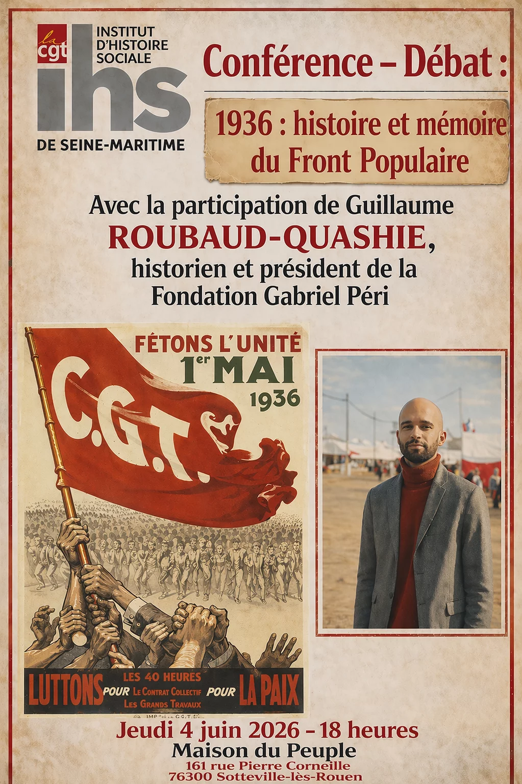 L’IHS-CGT 76 organise une conférence – débat sur le thème « 1936-2026: 90 ans de Front Populaire » avec Guillaume Roubaud – Quashie, historien et président de la Fondation Gabriel Péri. Cette initiative, animée par Florent Godguin (professeur d’histoire – géographie et président de l’IHS-CGT 76), sera l’occasion de présenter les nouveaux regards portés sur ce moment, […]