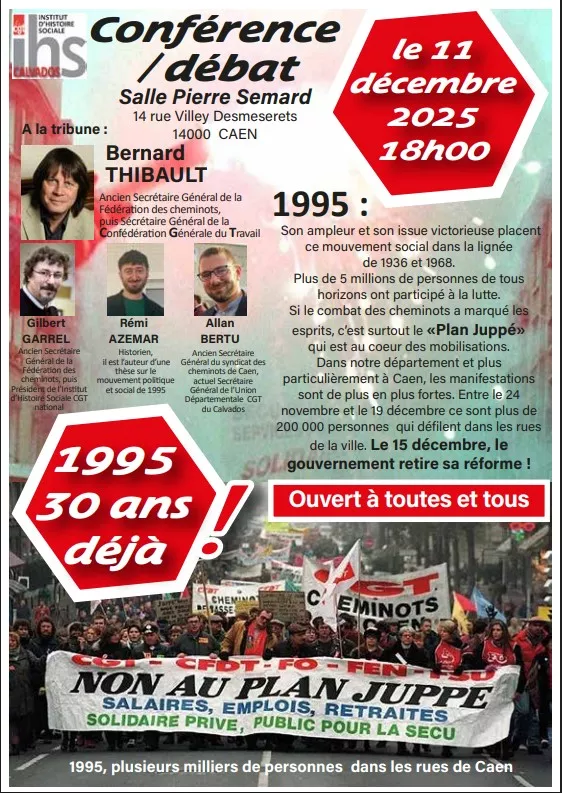Le 11 Décembre, 18h à la salle Pierre Semard, l’IHS CGT du Calvados organise une Conférence sur le conflit de 1995. » 1995, 30 ans déjà », en présence de Bernard Thibault, Gilbert Garrel, Rémi Azemar et Allan Bertu.